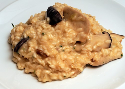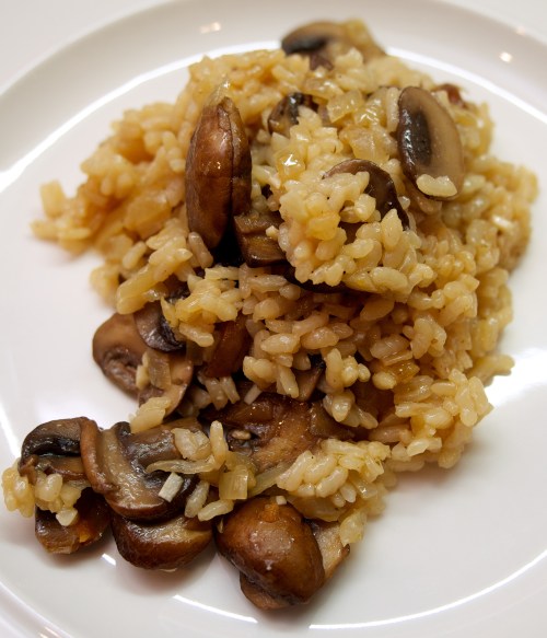 Put the onion and the rest of the oil in a heavy-based pan and fry slowly until soft. Add the garlic and cook for 3 minutes. Turn up the heat and add the rice, stirring until it is well coated with oil. Fry for a few minutes, then add the wine and cook until nearly evaporated. Turn the heat down to medium.