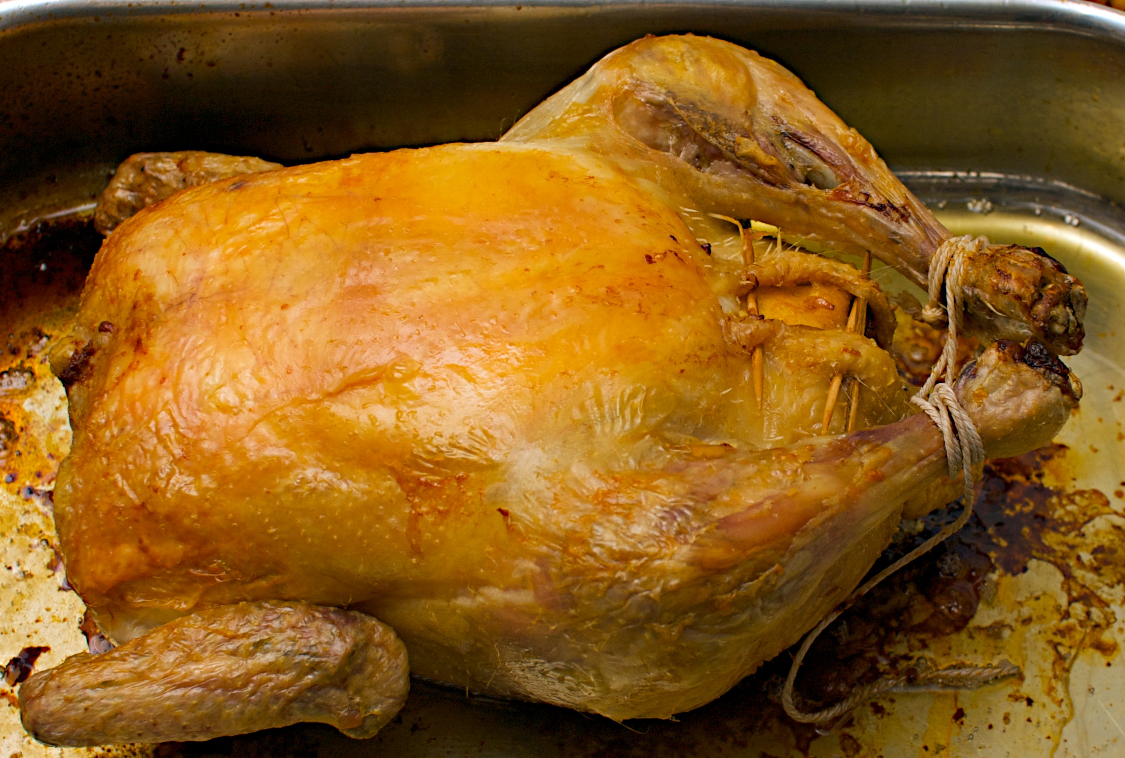 Roast the chicken for 20 minutes per 500g plus an extra 10 minutes, until the skin is golden brown and the juices run clear. Baste every 20 minutes as it cooks.