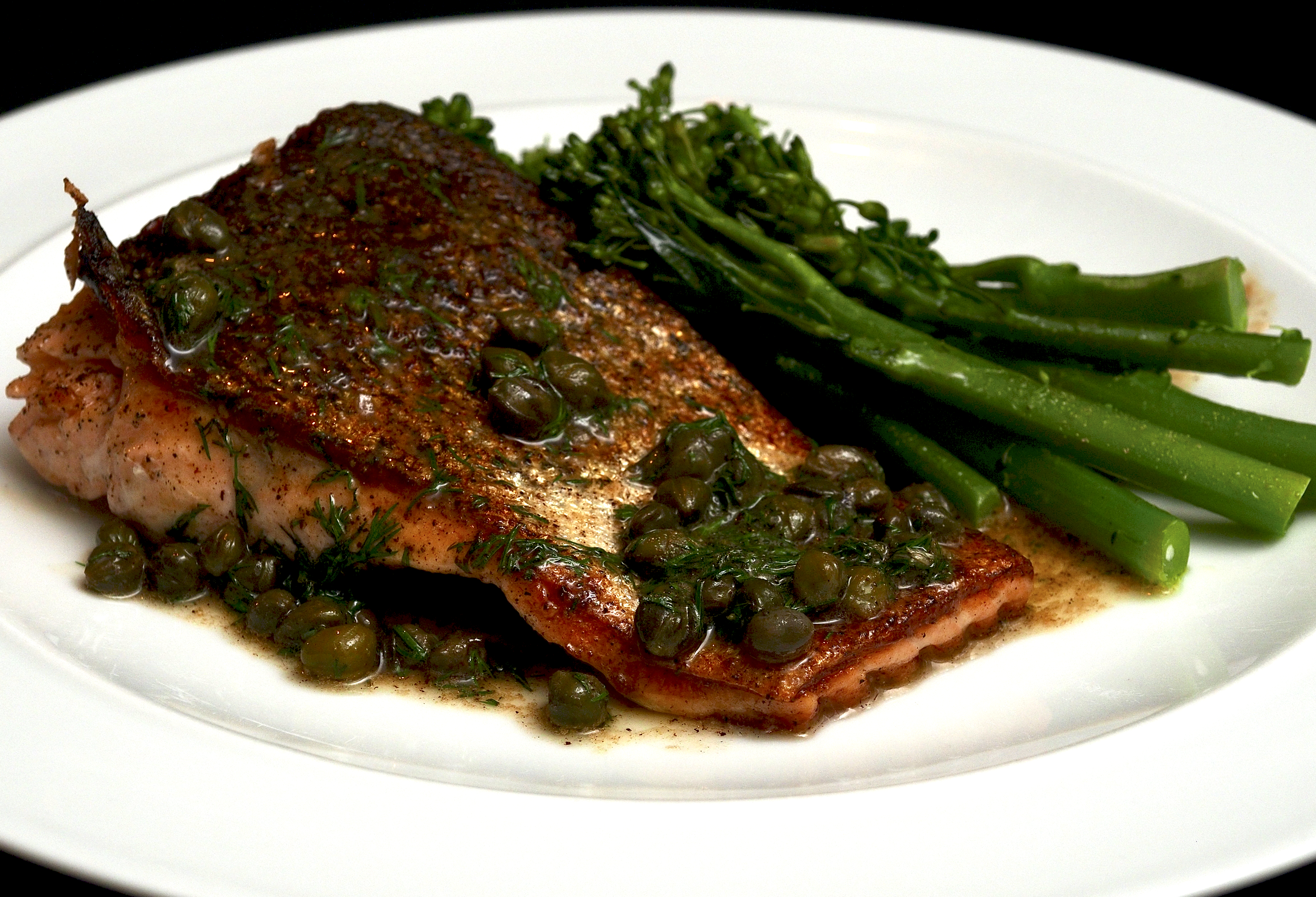 Add the capers, the rest of the butter and the lemon juice mixed with water, boil for 1 minute. Season to taste, then transfer the salmon onto warmed plates, stir in the chopped dill and pour over the fish to serve.
