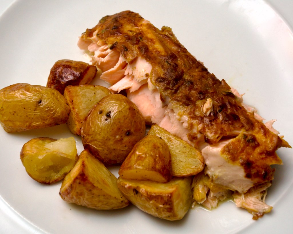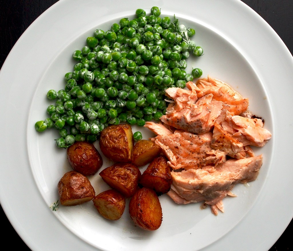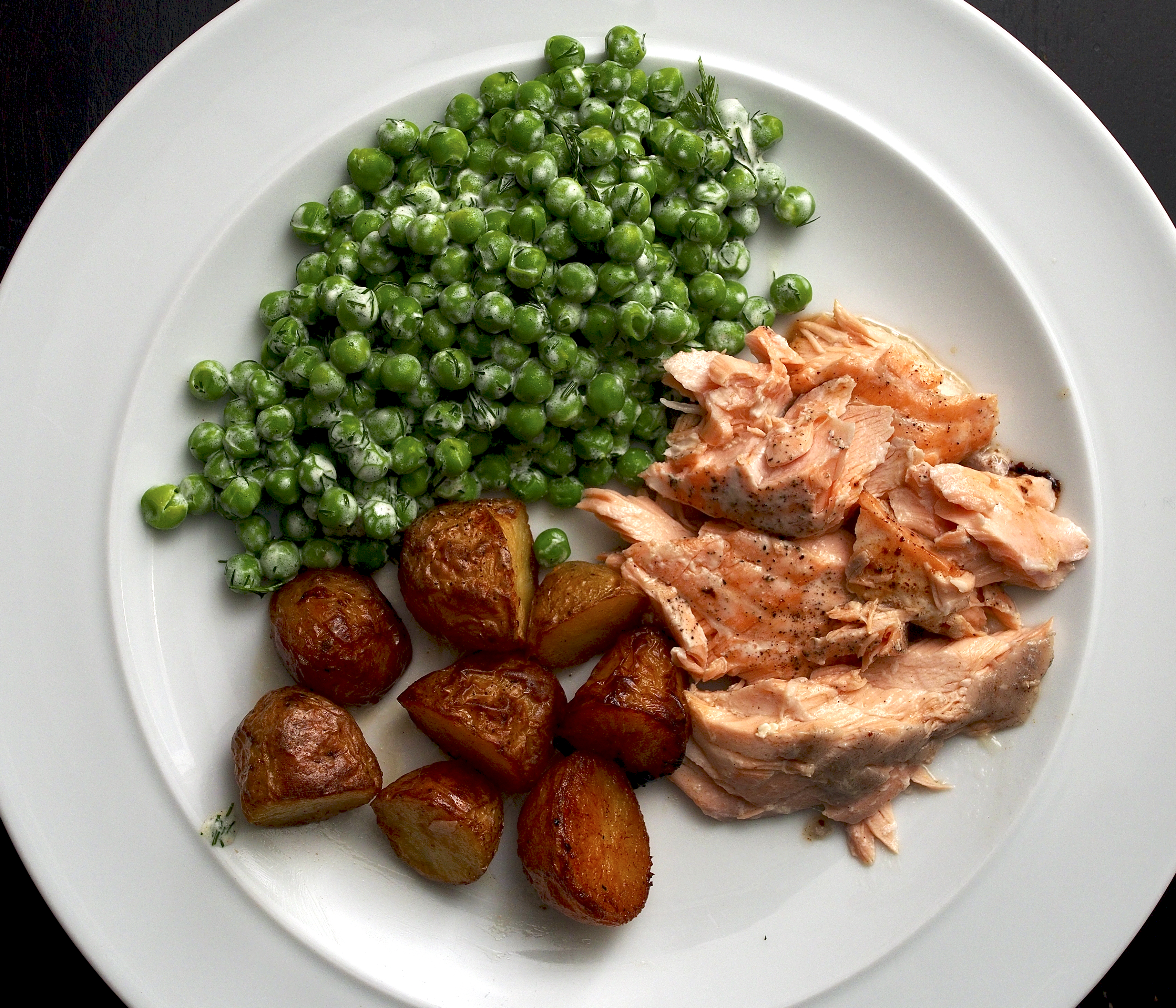 Roast salmon & potatoes with herby peas – serves 2 adults and 2 kids