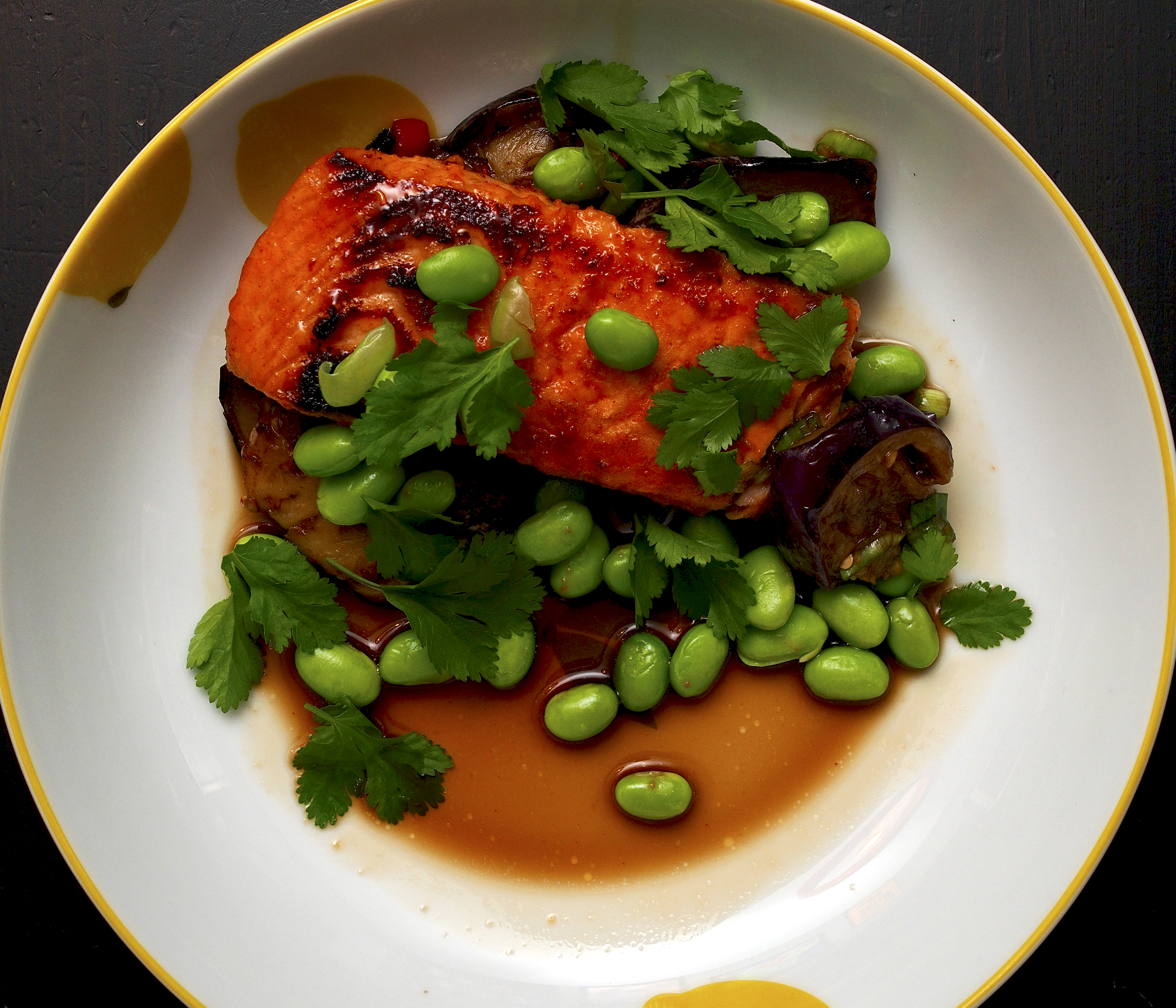 Chilli miso salmon with hot & sour aubergine – serves 4