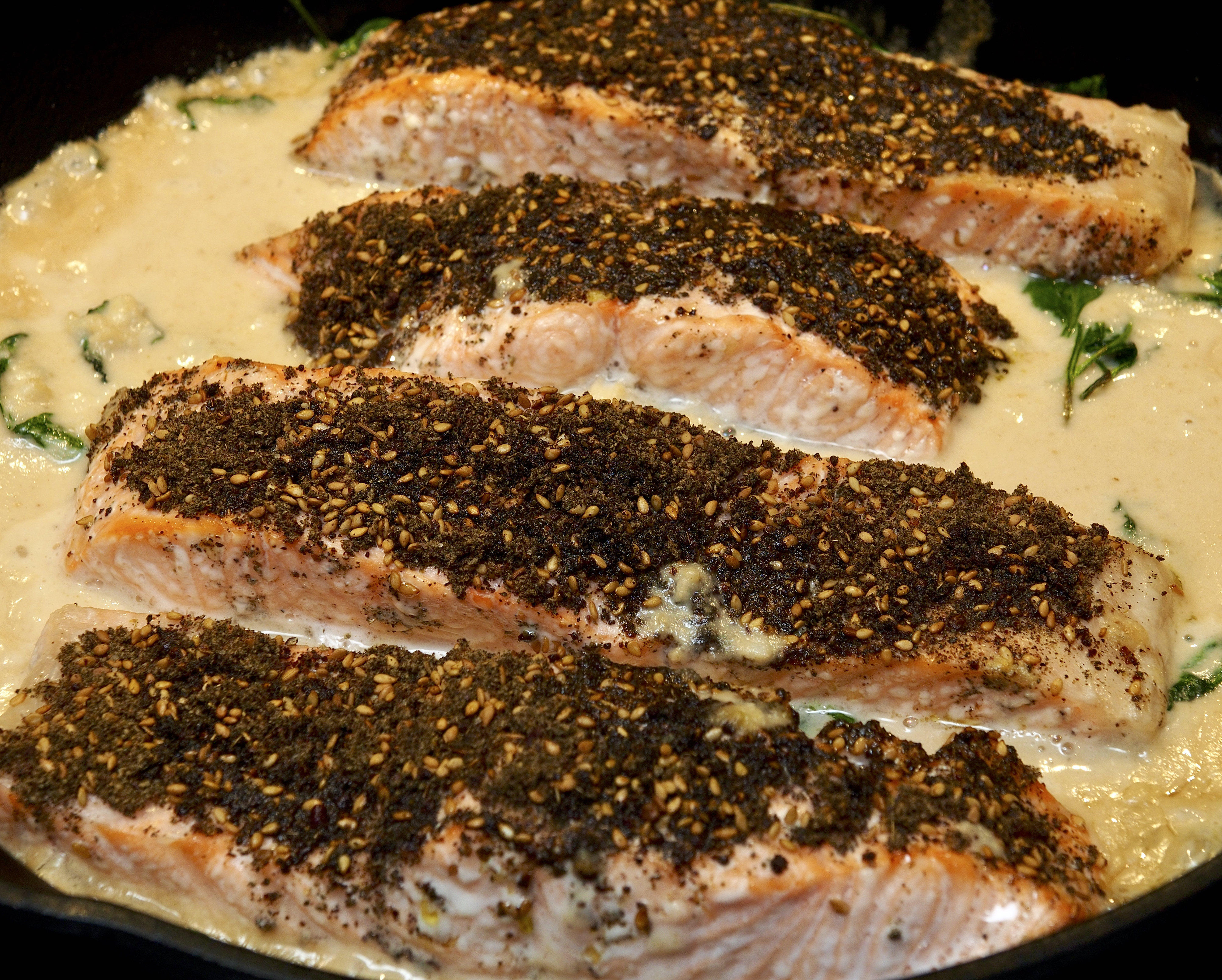 Mix the za’atar and sumac together in a small bowl, then sprinkle this over the top of the salmon to form a crust.