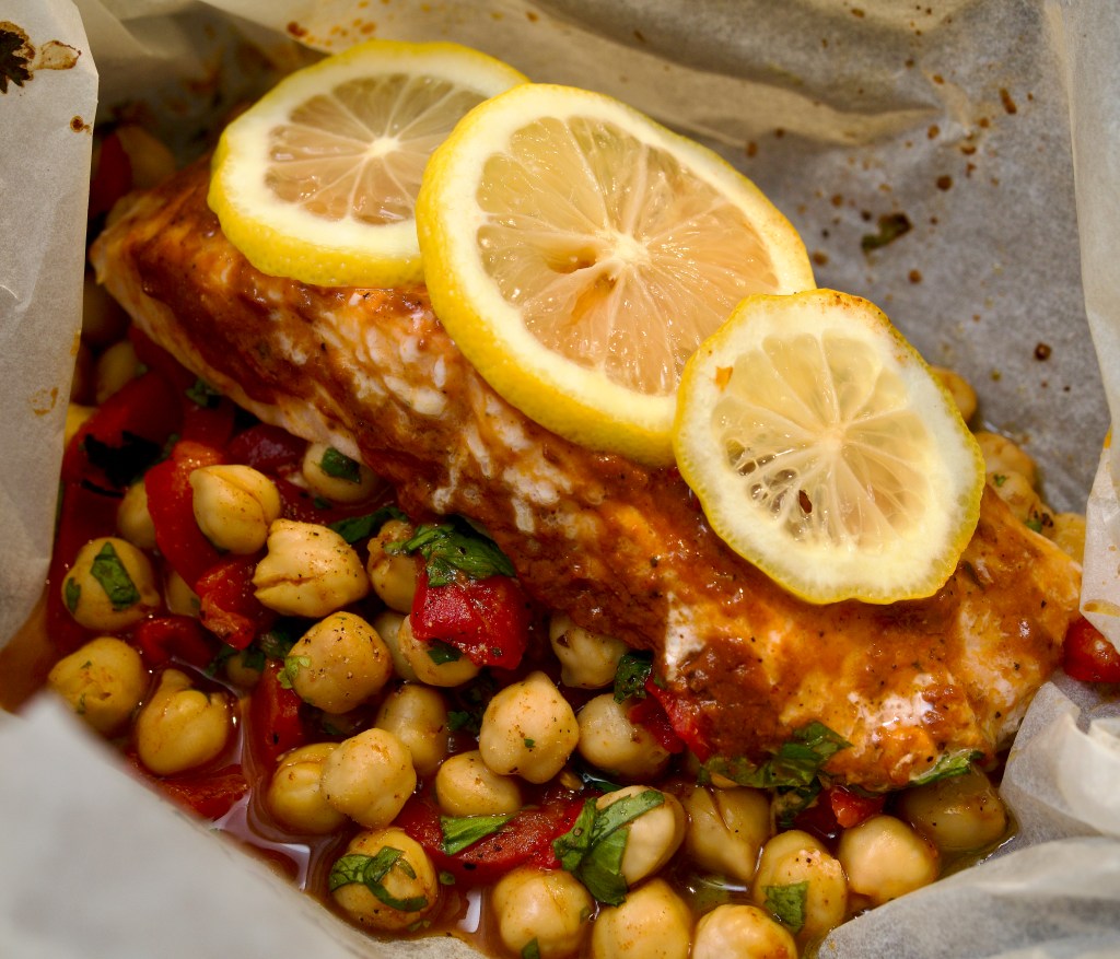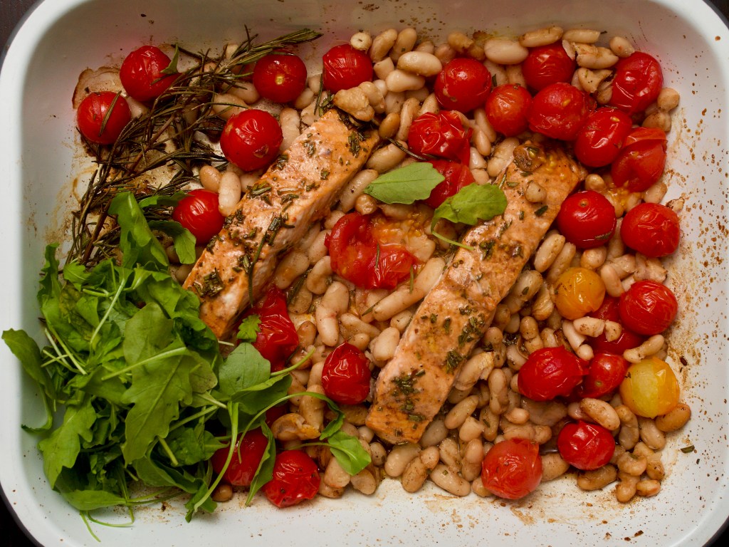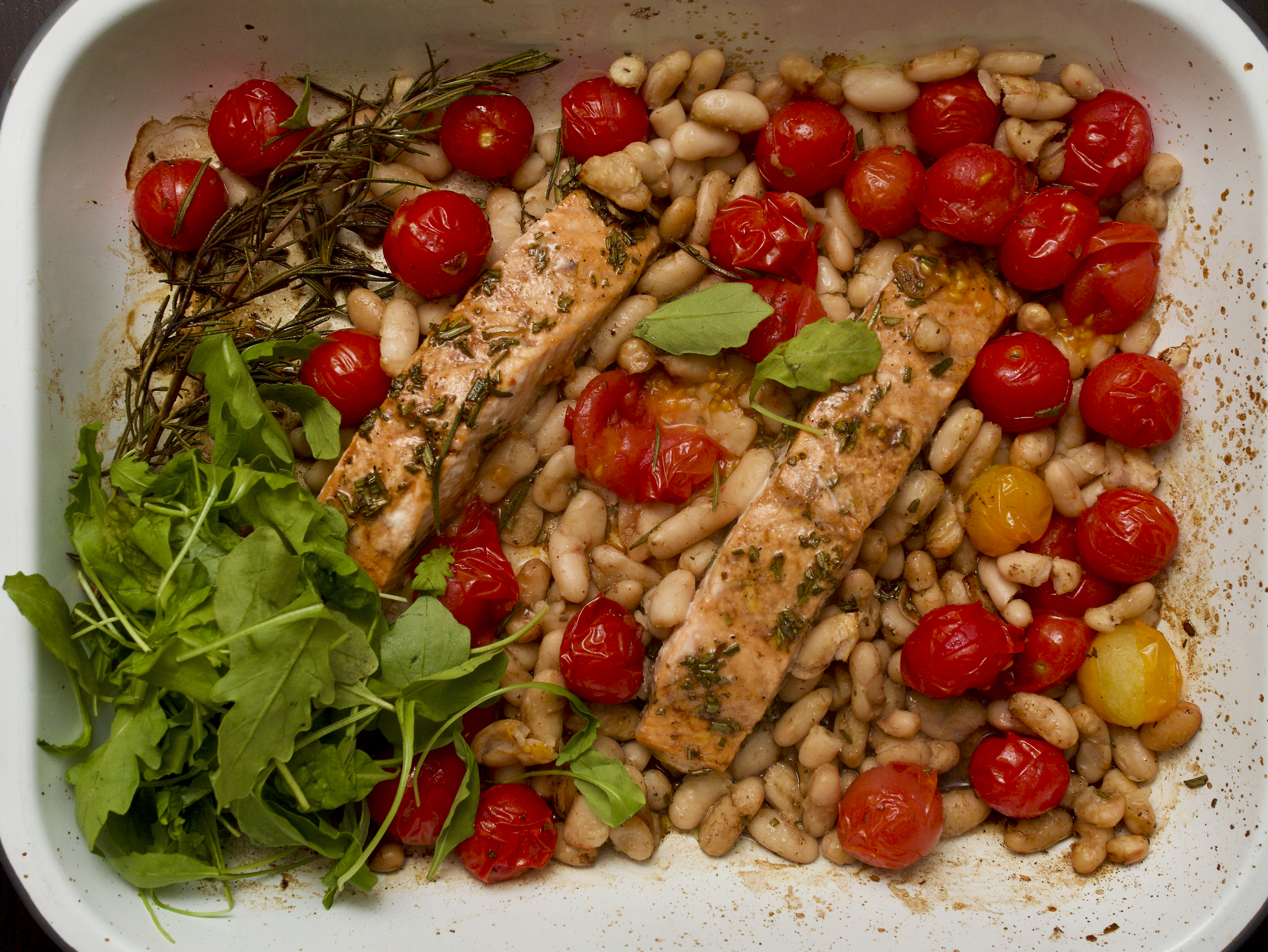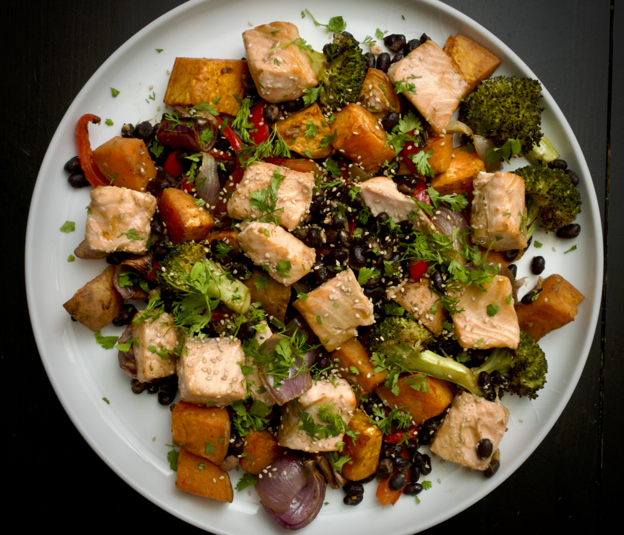 Salmon, veg and black bean tray bake – serves 4 to 6