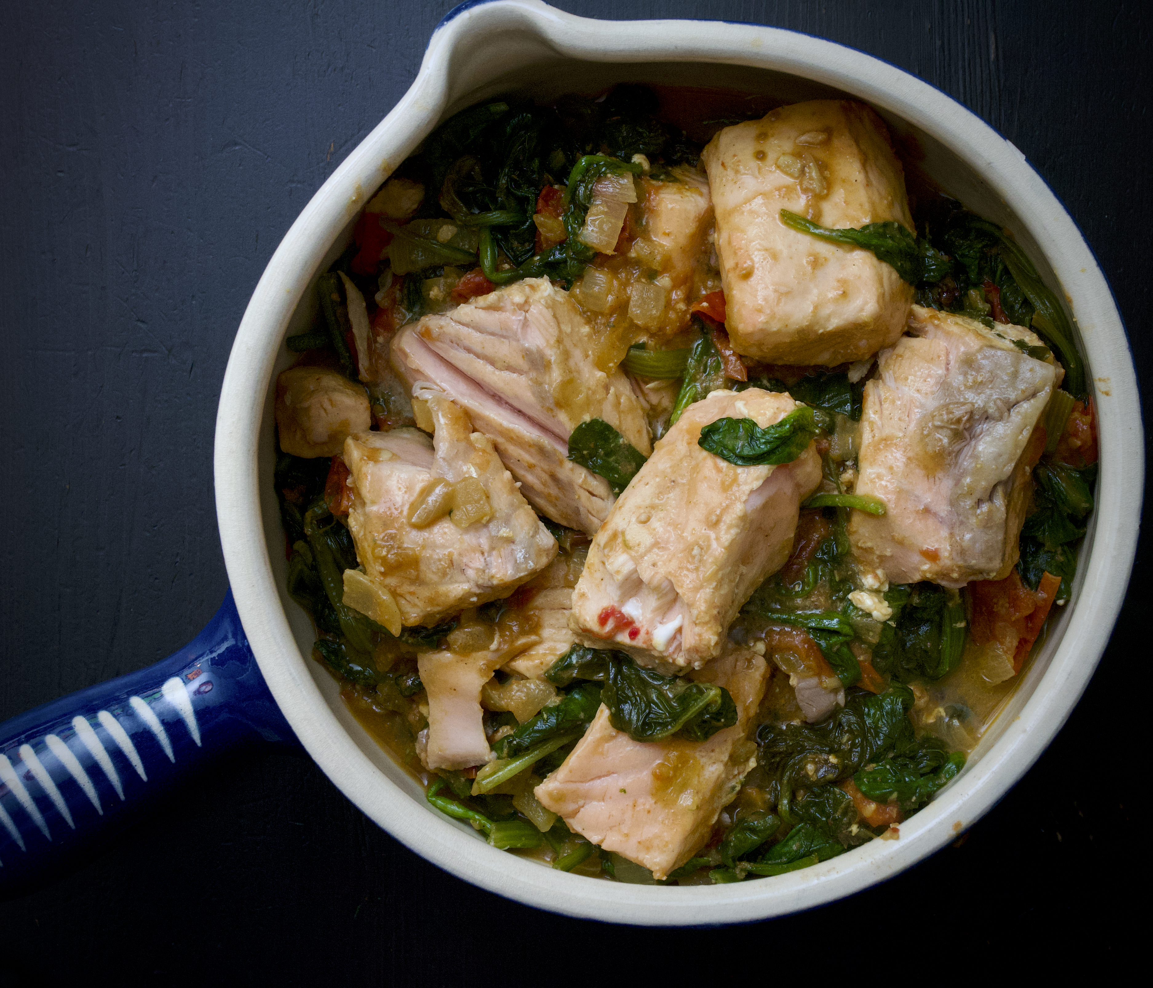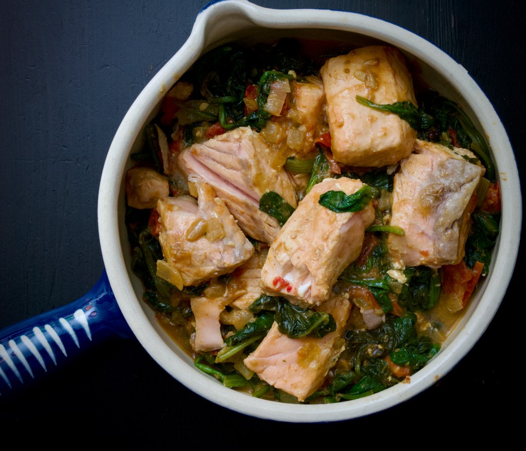 Return the salmon to the pan and push the bok choy in around it. Simmer for 2 minutes, pushing the bok choy into the liquid as it wilts. Once the salmon flakes easily, remove the pan from the heat.