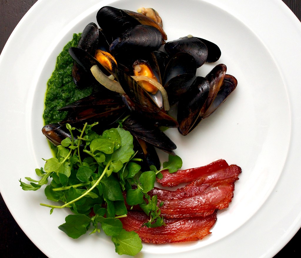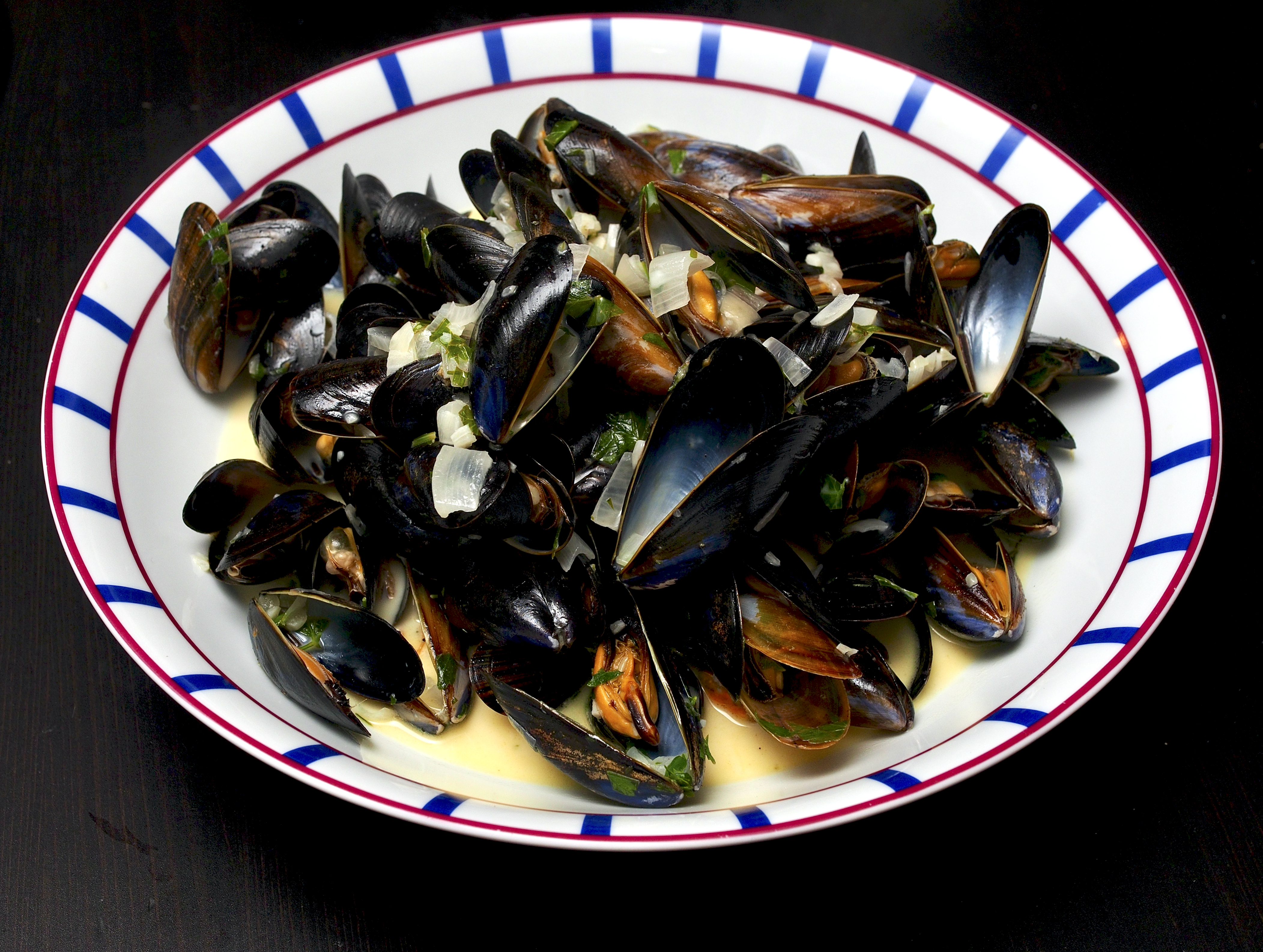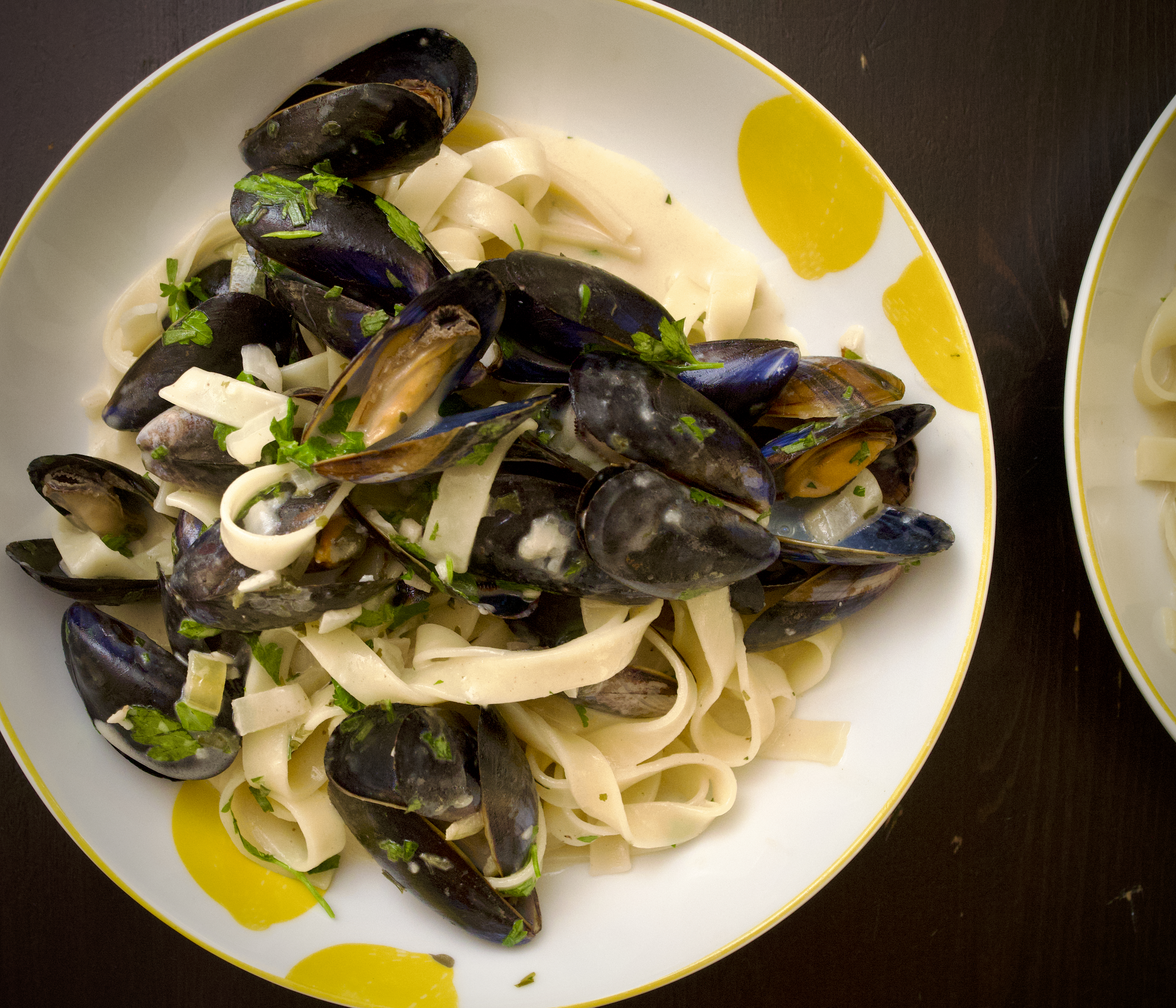 Meanwhile, heat a large pan, then tip in the mussels with the extra splash of white wine. Cover and shake the pan for a few minutes until the mussels have opened. Scoop the mussels out and set aside, keep the cooking liquid.