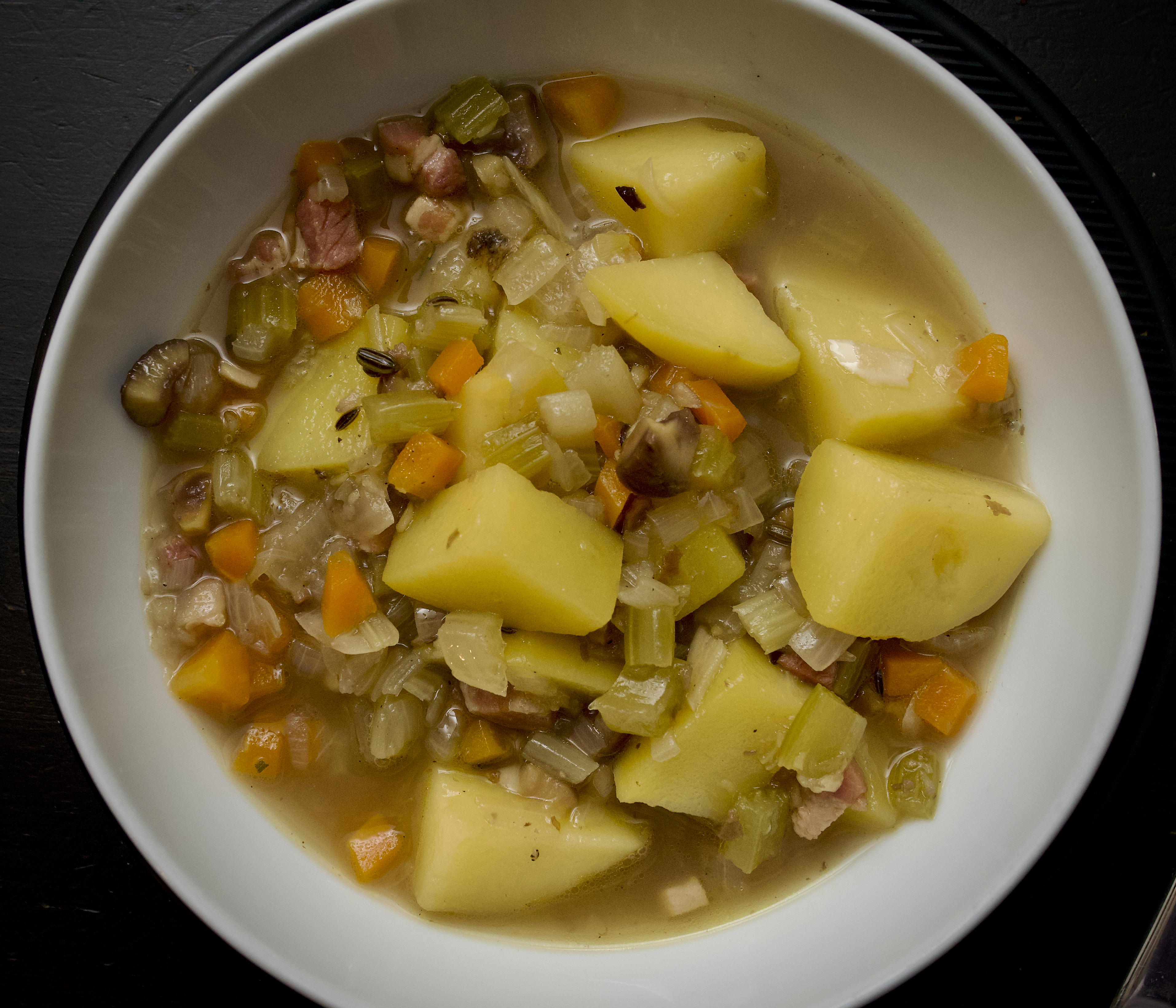 Add the rice, chicken and chicken cooking waterto the cooked vegetables and bring up to a gentle simmer. Cook for 30 minutes or until the rice is tender.