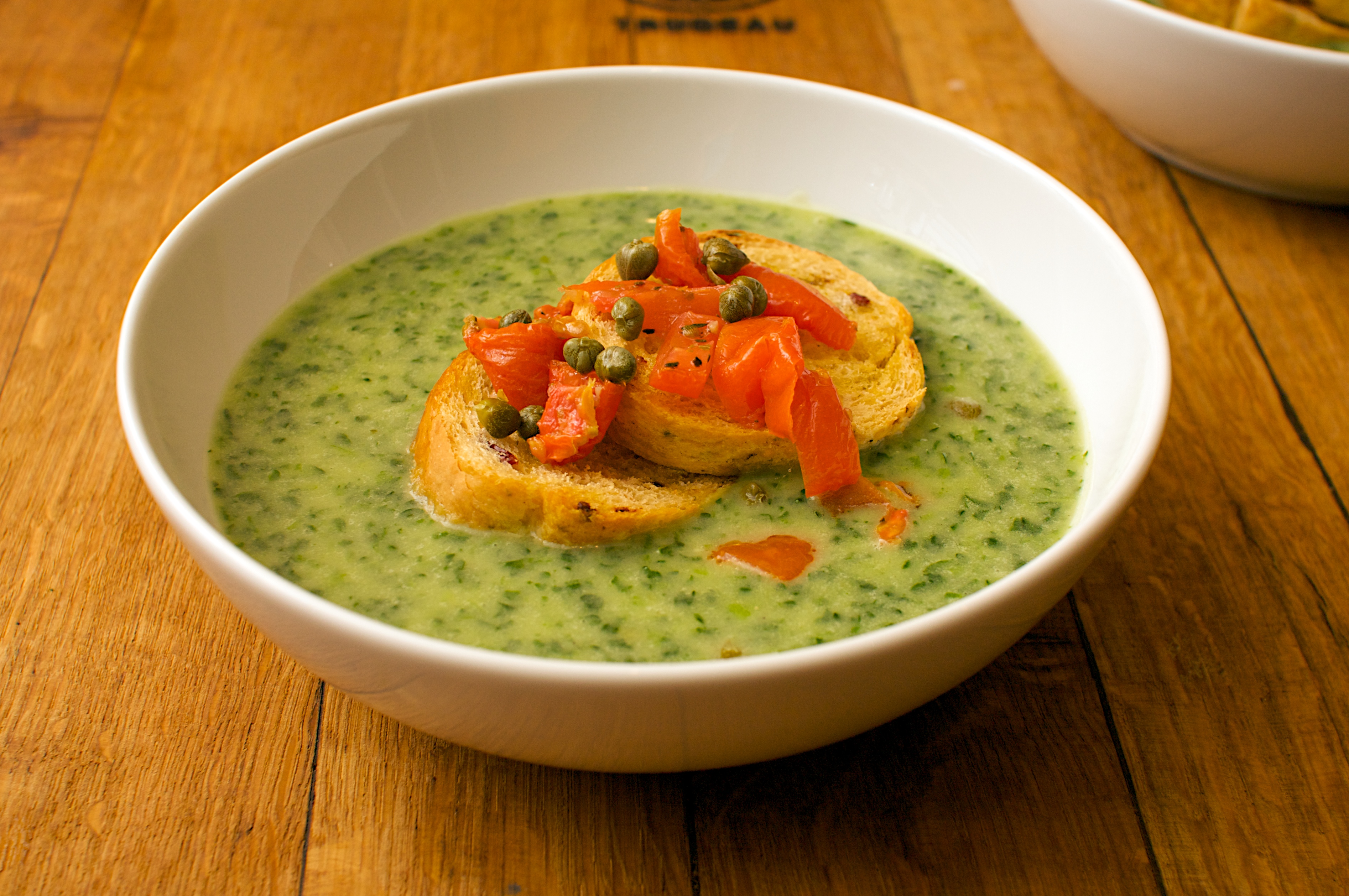 Chop the almonds very finely and stir into the soup. Taste and season if needed. Divide between 4 bowls, tear over some basil leaves and drizzle with some extra virgin olive oil.