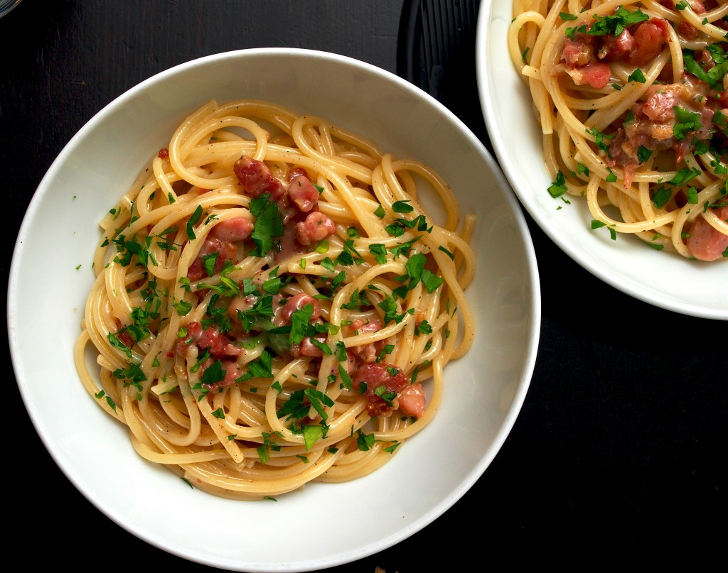 This is very rich and delicious so you can serve it in slightly smaller portions. The cooking time is a bit longer than our usual lemon spaghetti but it’s worth it for the flavour and silky texture. Perfect for an indulgent lunch at the weekend.