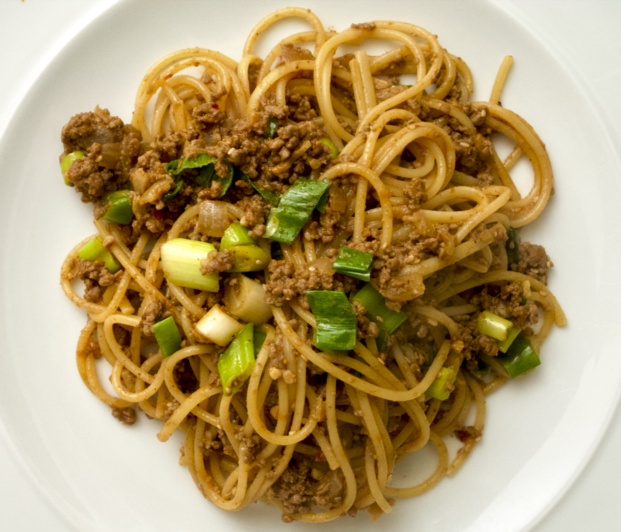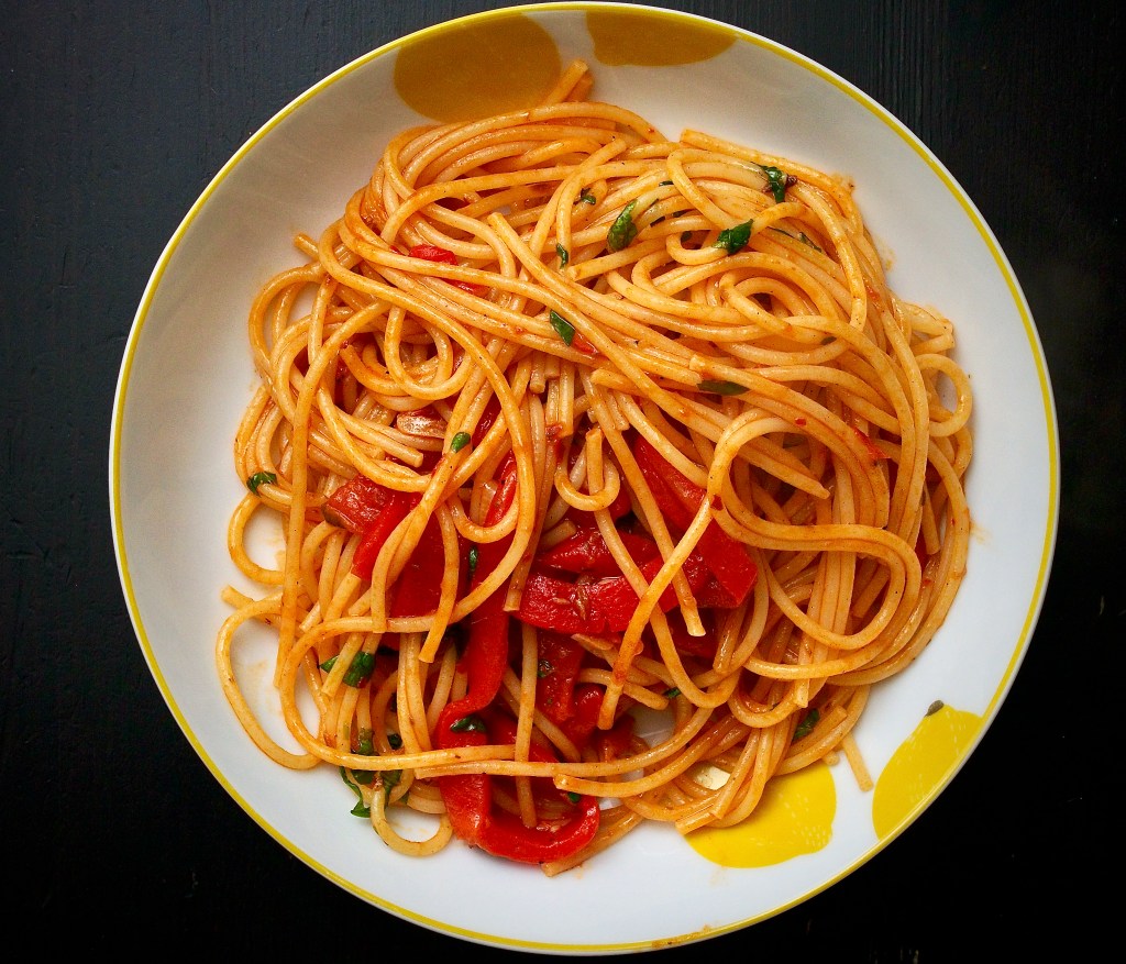 Cook the spaghetti in lots of salty water until al dente. Scoop out a mugful of the pasta water before draining.