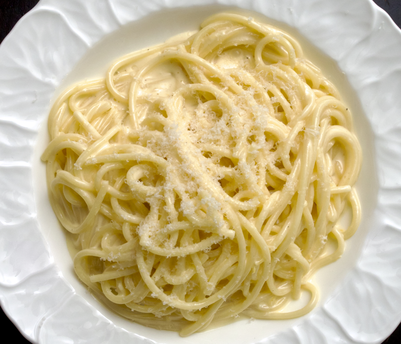 Turn the heat back down to low, then add the cooked spaghetti and toss to coat. Add the Parmesan, 1 tbsp at a time, as you did with the butter and waiting 30-45 seconds between each addition. Stir continuously and add another splash of pasta water if it starts to get stiff. Keep going until all the Parmesan has been added, then pour in the lemon juice and toss once more.