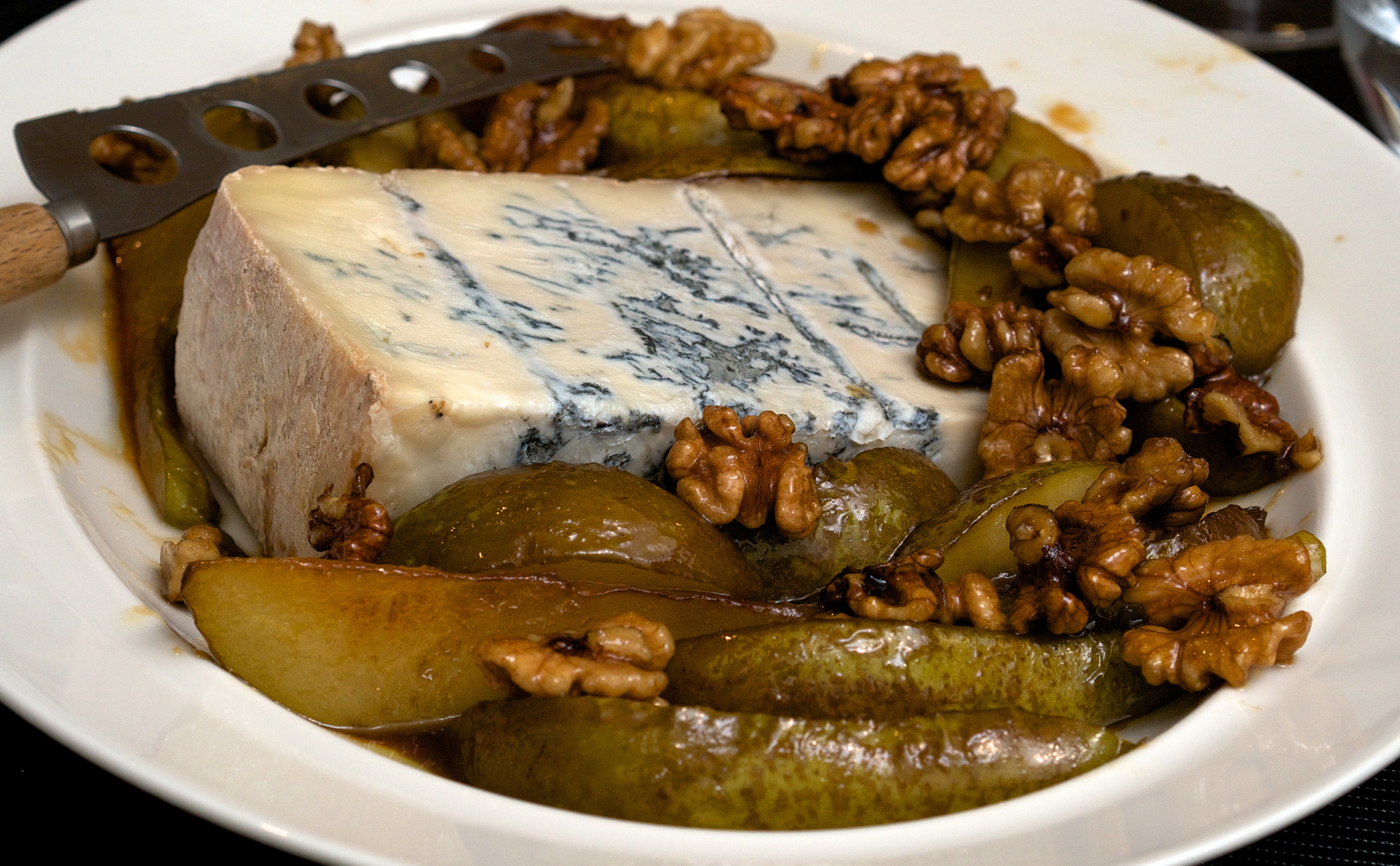 Add the walnut halves to the juices left in the pan and stir-fry for about a minute or until browned and sticky. Remove from the pan and scatter over the pears. Serve with the creamy slab of Gorgonzola on the side.